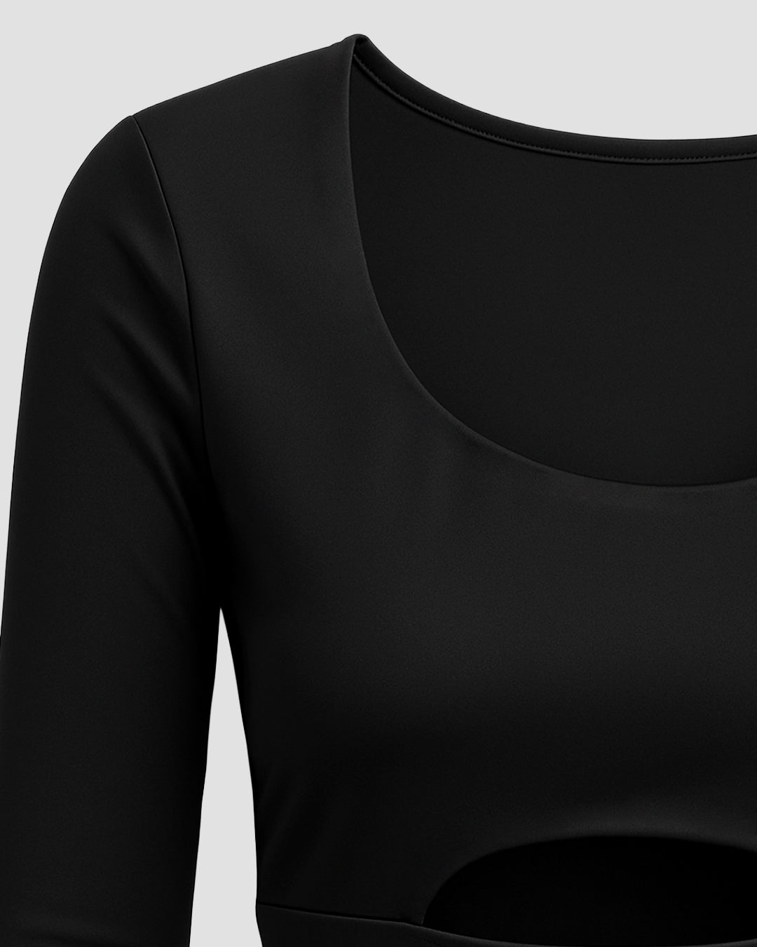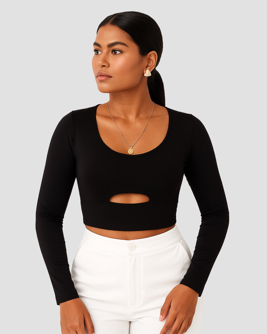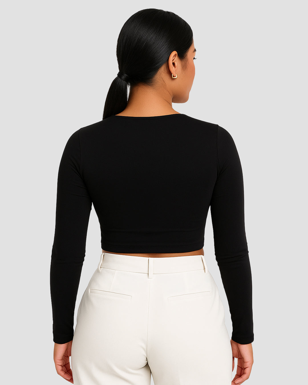 Descripción: Blusa manga larga con apertura en abdomen y cuello redondeado