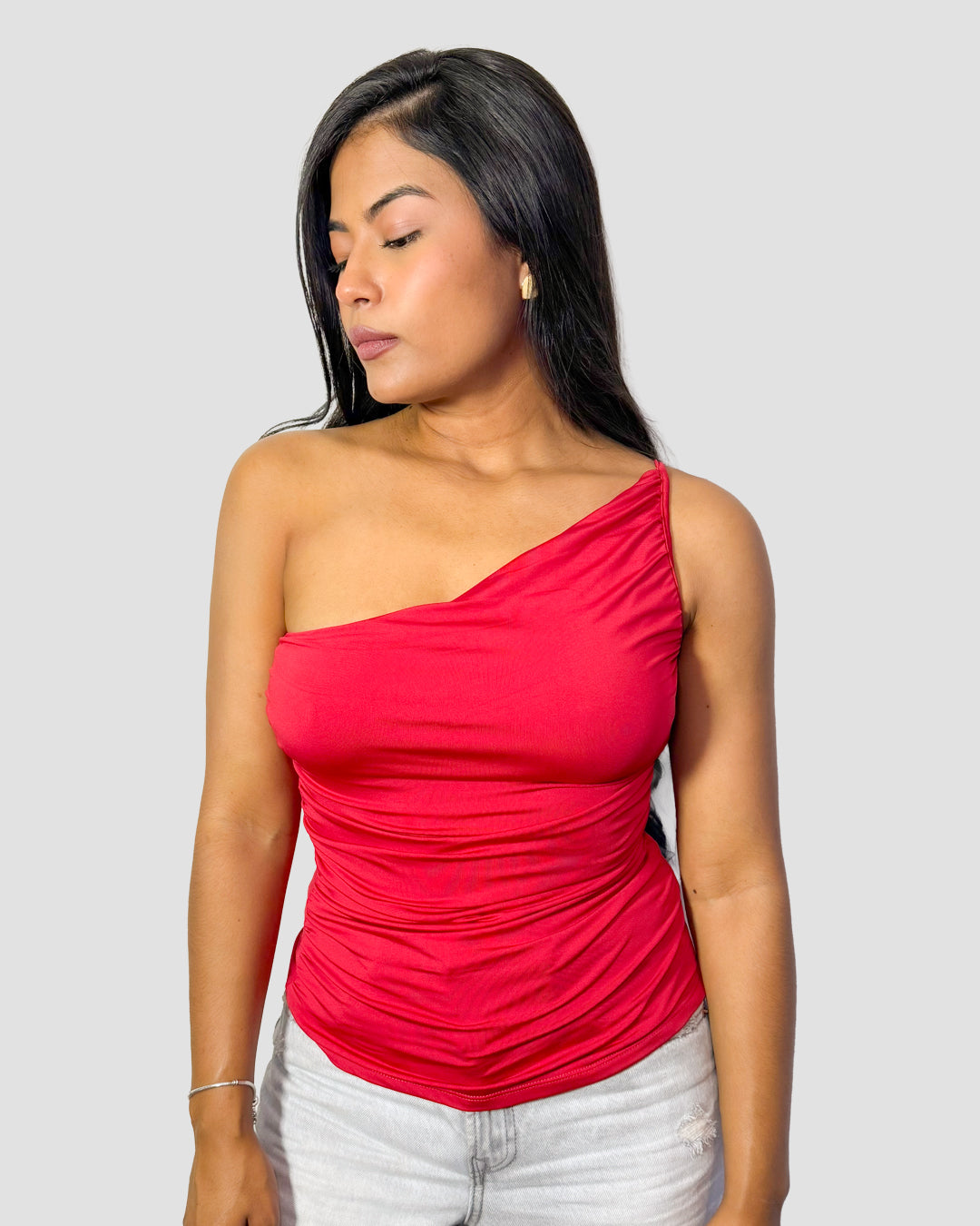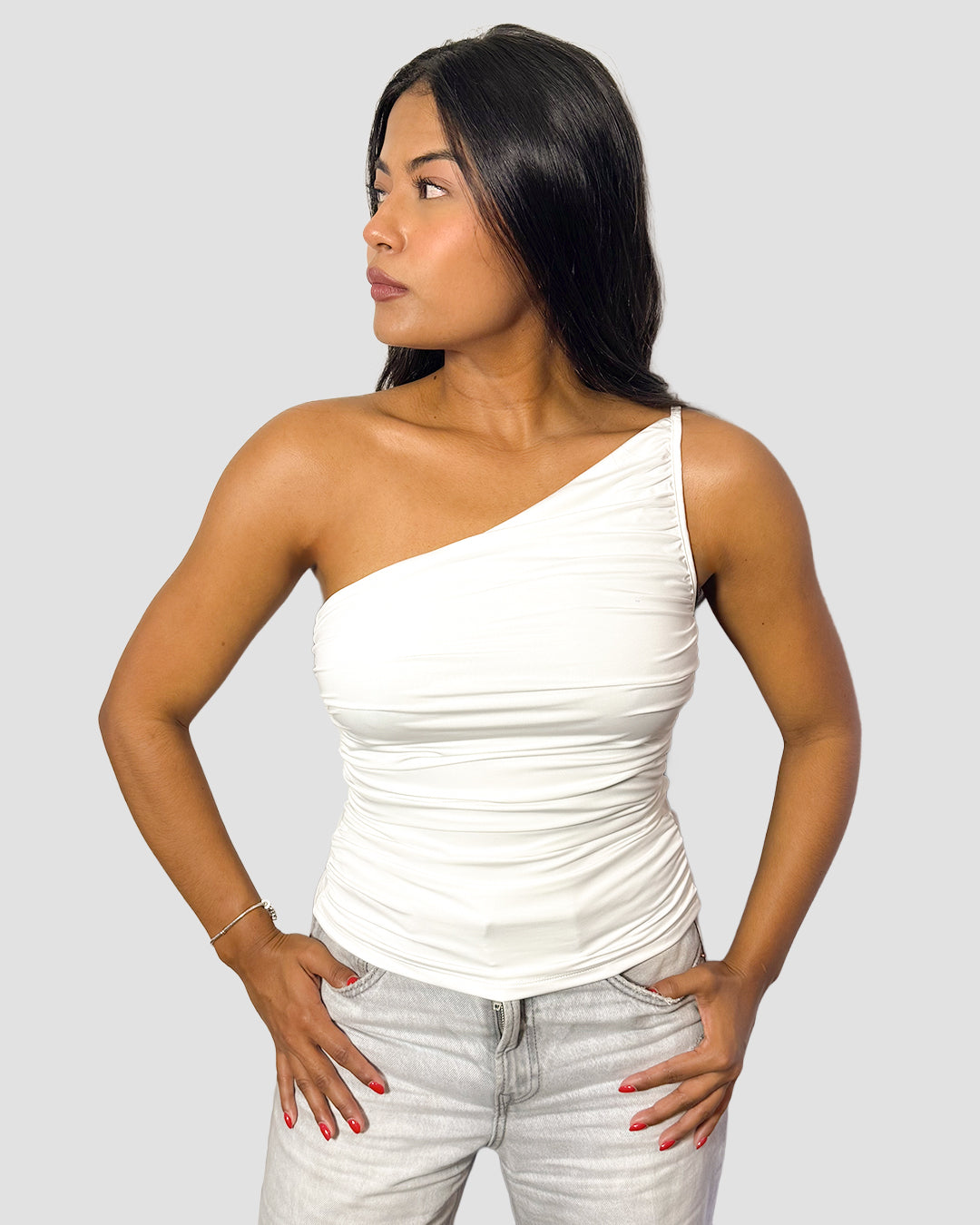 Descripción: Blusa asimétrica con recogido en la zona de abdomen, semi estraple
