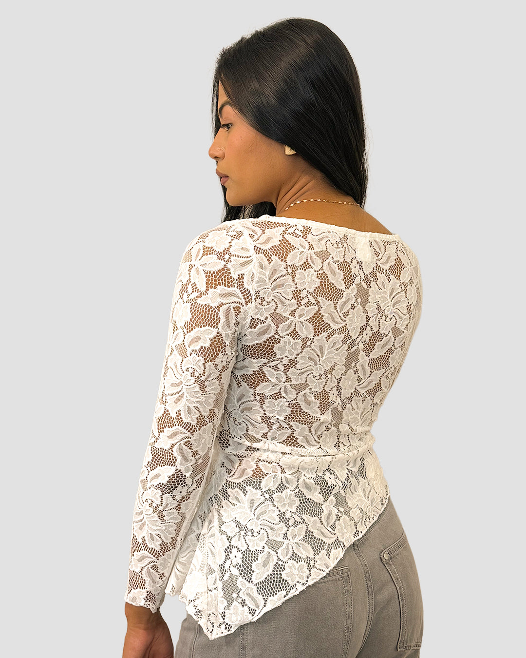 Descripción: Blusa manga larga de tela encaje floreada, forma asimétrica.