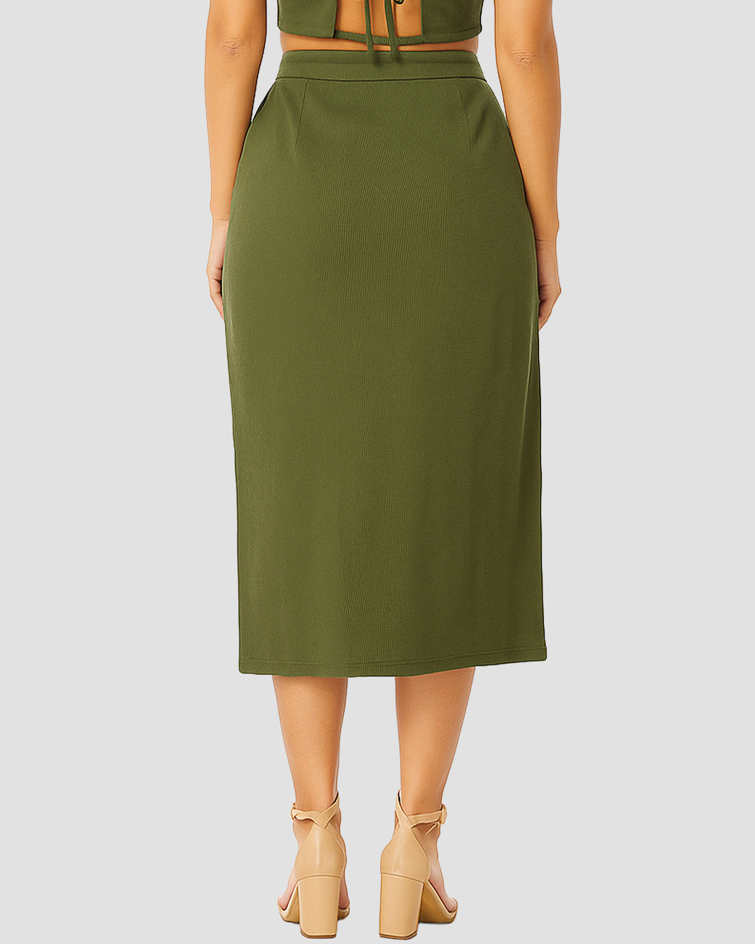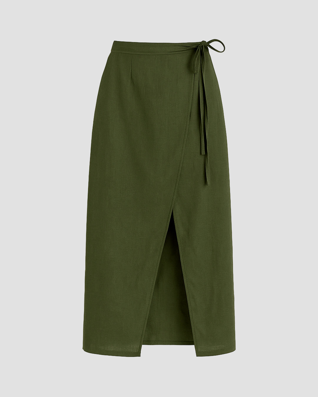 Descripción: Falda larga con amarre en cintura lado izquierdo y entrada profunda asimétrica