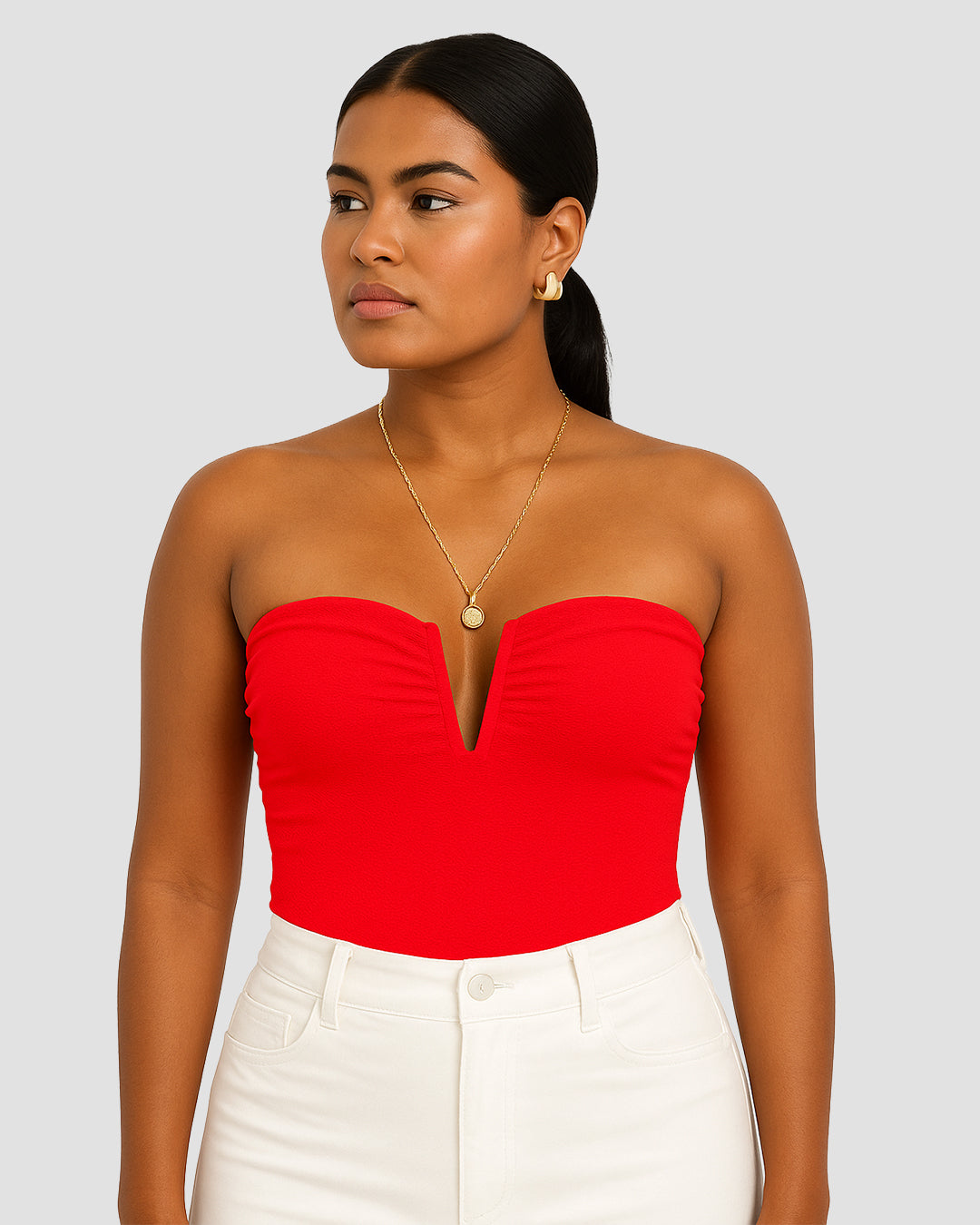 Descripción: blusa estraple con apertura en v en zona escote y recogido en los laterales